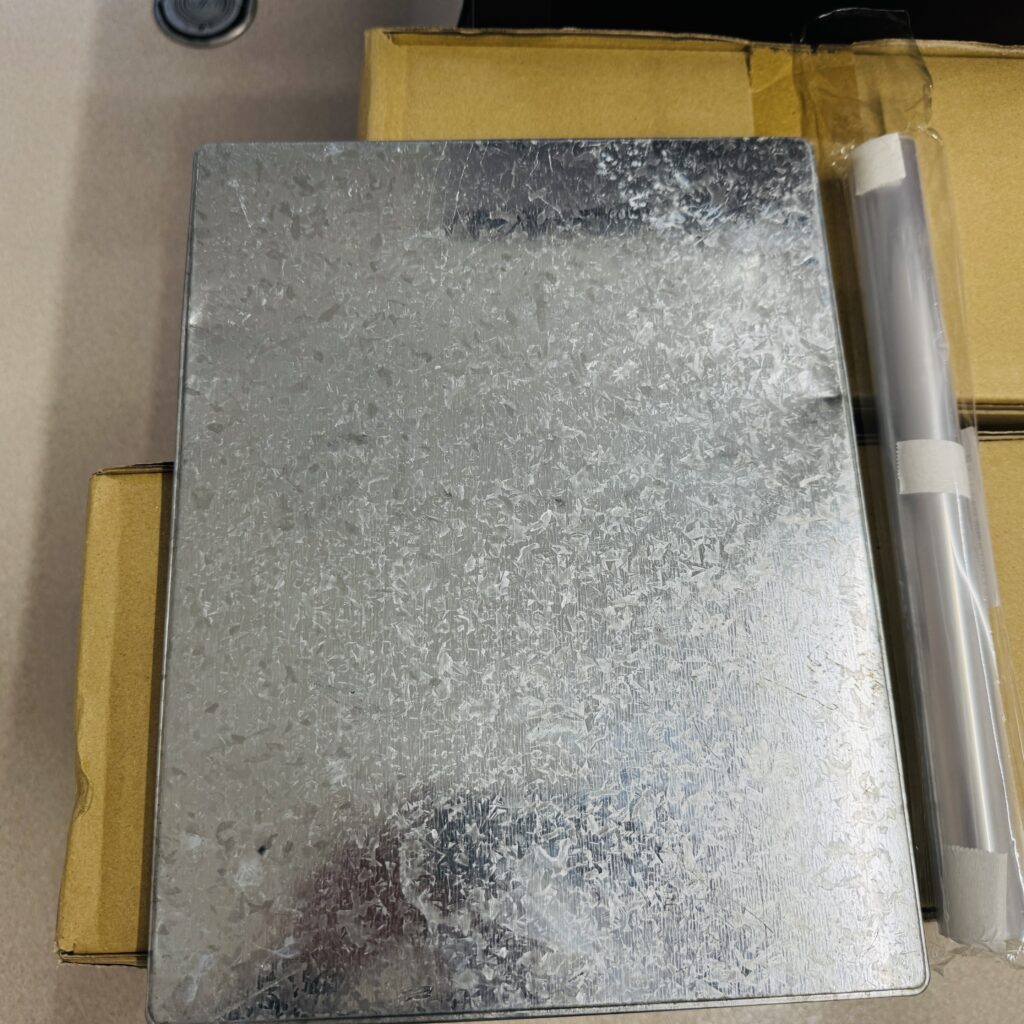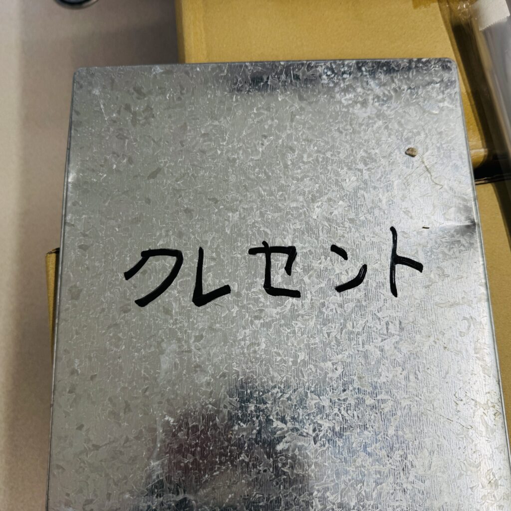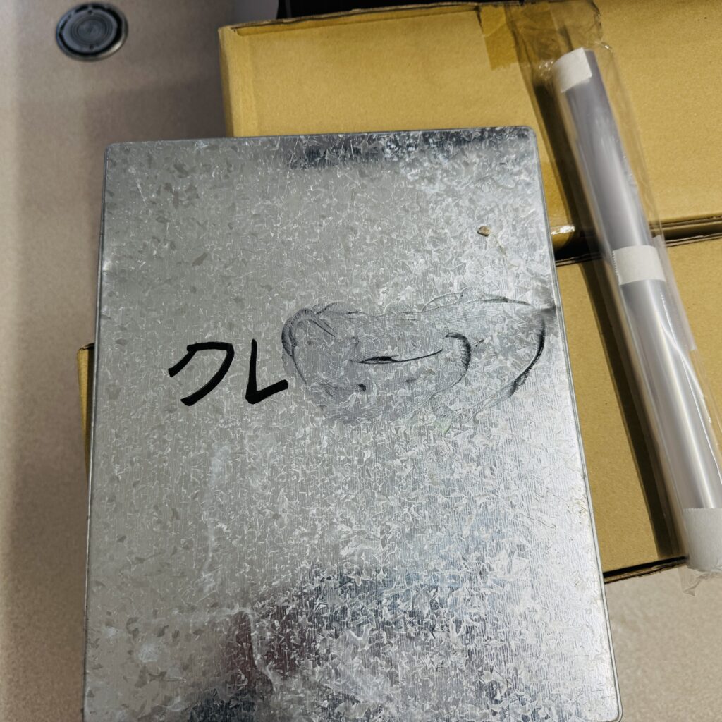 まずは、ブリキで出来た箱の蓋です。これに会社名を書いて消えるかを確かめてみます。